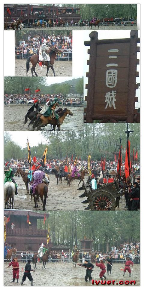 这个表演还比较有意思,演出中担任主要角色的都是参加过拍摄《三国演义》的马上特技演员,个个身怀绝技,每一匹骏马也都是参加多部影视剧目拍摄,训练有素的战马。因为下雨,场地上满是泥泞,演员可以说是非常敬业,也并没有因此而失去表演的热情,马匹奔跑的泥水飞溅得满身都是,(我想脸上也很难避免),但他们还是很投入地演出着,他们真刀实枪地为大家演绎了一幕扣人心弦、惊心动魄的古代马战,不时博得观众的惊呼声。