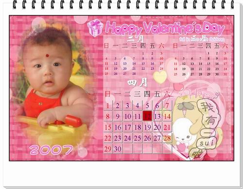 好早就答应阿霞帮小帅哥做份新年日历,可因为种种原因现在才能静下来帮她做。昨天下了一些软件,开始了我的第一次日历制作过程。因为系统重装,很多字体软件都不见了,下软件找图片一直做到凌晨一点才睡!可能是因为比较赶,图片没找到很pp的,今天看起来感觉很俗气,结果把昨天做的全都否决,今晚又重新做了几张。今年的情人节就是这样过了。